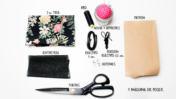 Los botones yo he utilizado 5 botones nacarados para no quitarle protagonismo a la tela y por lo demás, lo que se ve en la foto.