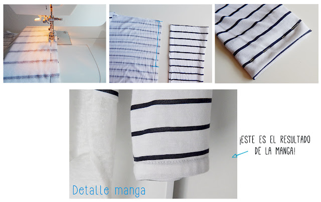 Vamos a por las mangas, cose la manga. Para unirla con el cuerpo de la camiseta, pon la camiseta del revés y la manga del derecho, métela por la apertura que has dejado para la manga y cóselo. Pruébate la camiseta para ajustar el largo de la manga y cose el bajo de ambas mangas.
