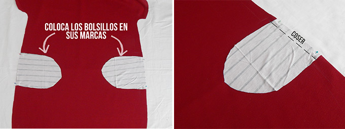 Después, coloca en una superficie plana la parte delantera del vestido con el derecho hacia arriba. Encima pon a cada lado una de las partes del bolsillo con el derecho hacia abajo (como se muestra en la imagen), pasa un pespunte sencillo para unir el vestido y el bolsillo. Repite esta operación para las dos piezas traseras del vestido.