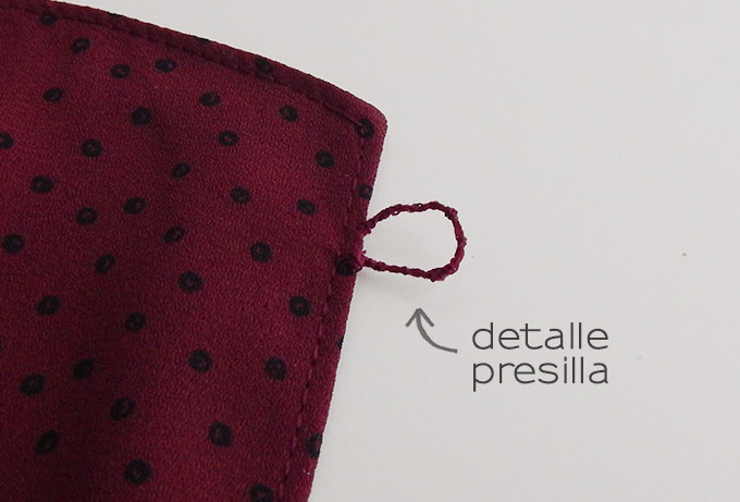 Lo primero que tienes que hacer es pasar un hilo de un lado de lo que será la presilla al otro, pero en vez de tirar del hilo hasta que quede pegado a la tela, deja el dedo índice dentro, repite este proceso unas tres veces (de un lado al otro). Cuando ya hayas pasado el hilo tres veces, es decir que te quedan tres hebras de hilo, lo que tienes que hacer es unirlas pasándole un hilo alrededor. Para pasar el hilo fíjate en el quinta imagen, no lo paso liándolo sin más, sino que lo paso por debajo de la presilla, pero también por debajo del propio hilo, de este modo se hacen como mini nudos. Este proceso lo tienes que hacer alrededor de las tres hebras de hilo formando así la presilla, cuando llegues al otro extremo da un par de puntadas de seguridad. Procura que estas puntadas no atraviesen la vista, así no se verán puntadas por el interior de la blusa.