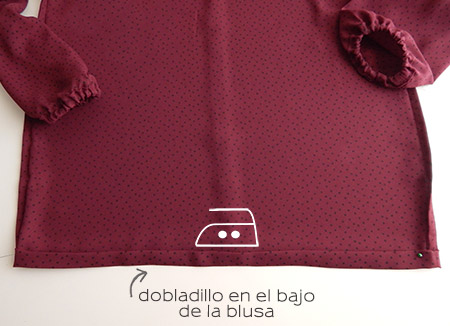 Por último queda probarse la blusa y coger la largura del bajo. Sujeta con alfileres y para ayudarte ves planchando a medida que haces el dobladillo del bajo. Pasa un pespunte sencillo por todo el bajo y ya tienes tu blusa.