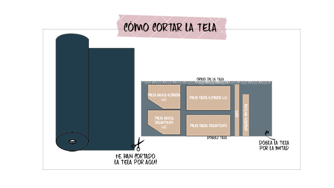 Para cortar las piezas del vestido, dobla la tela por la mitad con los derechos enfrentados, y pon los patrones tal como se ve en la imagen.