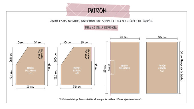 Te dejo las medidas que yo he utilizado, yo he usado la talla S, pero también de dejo los patrones para otras tallas, que van desde la XS hasta la XL (talla española).
