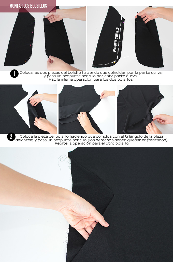 Coge la pieza delantera y las piezas que conforman el bolsillo y antes de formar el bolsillos vamos a coser las dos piezas del bolsillo, para ello, únelas por la parte curva y pasa un pespunte sencillo. Una vez tengas formados los bolsillos vamos a unirlos la la pieza delantera. Finalmente, con los derechos enfrentados haz coincidir el triángulo de la pieza delantera con el bolsillo, pasa un pespunte sencillo por este triángulo, plancha bien las costuras y ya tendrás formado el bolsillo. Repite la operación para el bolsillo del otro lado.