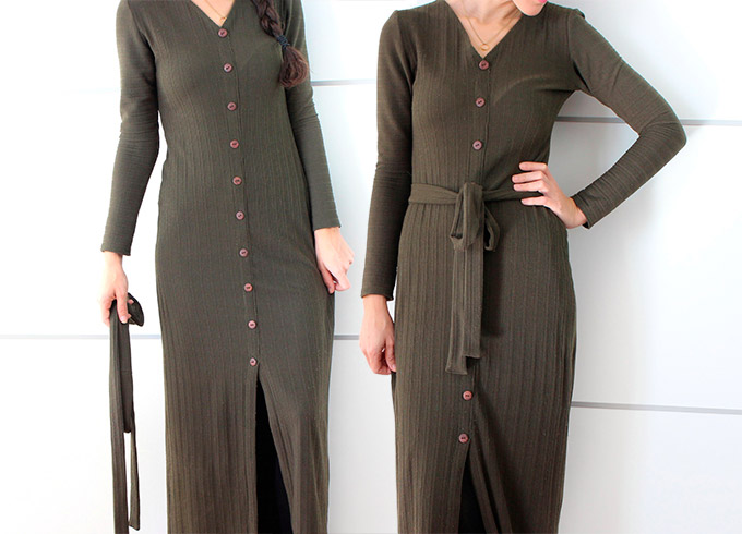 ¡Hola! ¿Qué tal estáis? Esta semana vengo con el paso a paso para hacer este vestido largo de punto canalé abotonado. Para hacer este vestido he partido de un vestido ajustado, pero si no tienes puedes hacer con una camiseta y falda ajustada. En el vídeo verás qué le hago un par de modificaciones por son tan simples que no vamos hacer un patrón específico para este vestido. Como ves el vestido lleva botones en la parte central, pero en realidad es una abotonadura falsa, es simplemente el efecto para hacerlo así mucho más fácil todavía. Así que ya verás que es un vestido muy sencillo de hacer.