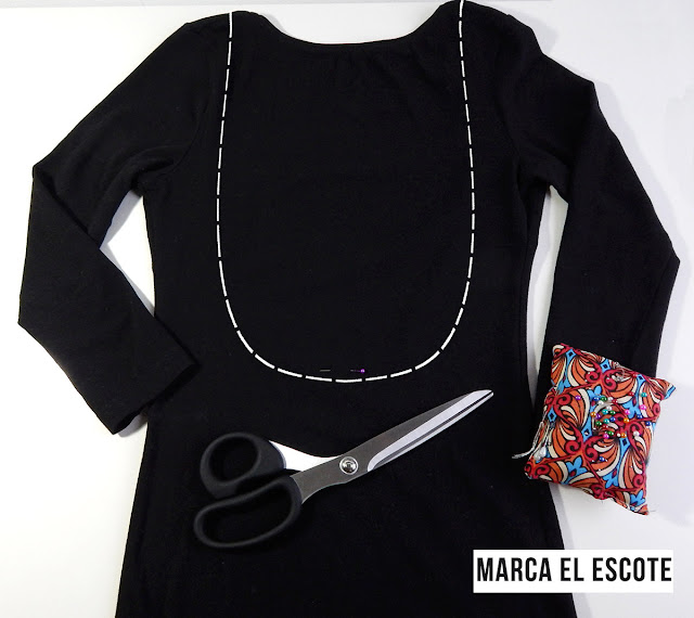 Lo primero que vamos hacer es probarnos el vestido y ver a que altura quieres que quede el escote de la espalda, marca el final del escote con un alfiler. Cuando lo tengas marcado, pon el vestido en un superficie plana y dibuja cómo quieres que sea el escote, teniendo como referencia el alfiler que acabas de poner.
